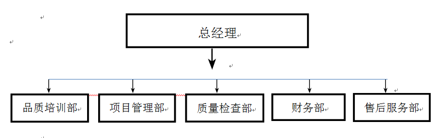 公司实行总经理负责制,实行项目专业化管理。通过总经理办公会议决定公司重大事项。公司设总经理、办公后勤部、财务部、项目管理部、质量检查部、售后服务部、品质培训部。